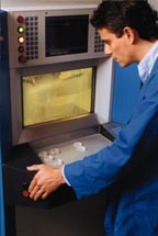 In Monroe Community College's laboratory (above), Emmett Ientilucci, a graduate of MCC's optical fabrication training program, watches as an SPM 50SL generator donated to MCC by LOH Optikmaschinen shapes a lens. (Photo by Andrea C. Martino & Vincent J. Rotella/MCC).