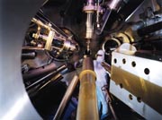 THE NATIONAL The National Ignition Facility (NIF), being built by Lawrence Livermore for the Department of Energy, will integrate civil, commercial, and national security research in a single facility. When NIF's 192-beam laser is operational, LLNL researchers estimate they can achieve inertial confinement fusion ignition within a decade, leading to the production of safe, clean, and abundant energy. Fusion-powered plants are expected to replace fission plants during the next century, thus limiting radioactive inventories by a factor of 1000 and markedly reducing radioactive wastes. New technologies for NIF's engineering and optics requirements are being developed in coordination with more than 300 team members from science, academia, and 35 U.S. corporations. The NIF laser will be the world's largest optical instrument, its total precision optical surface area measuring three-quarters of an acre, 40 times that of what is now the world's largest telescope, the Keck Telescope in Hawaii.